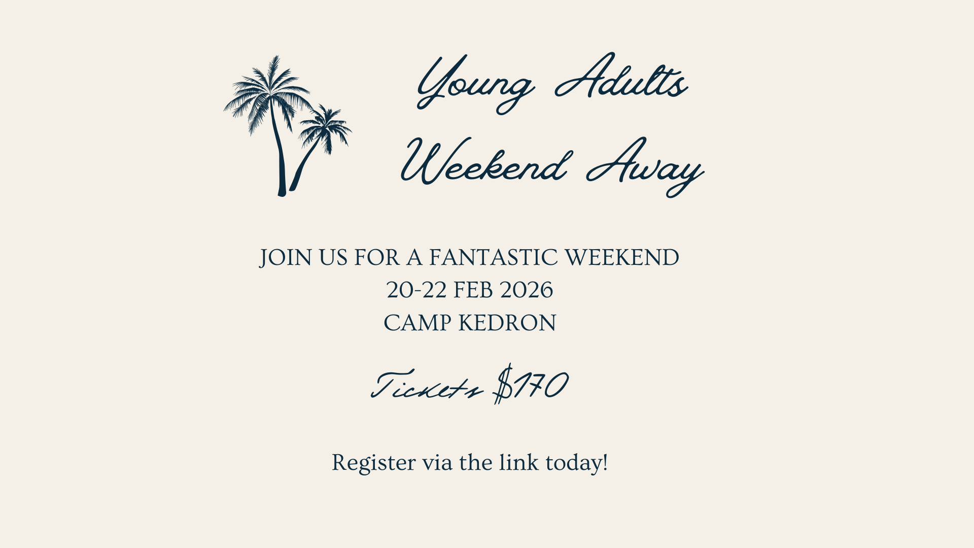 This year we're heading to Camp Kedron on the Northern Beaches. It's a great venue with lots of indoor and outdoor options as well as being close to the beach. Arrive anytime after 7pm (although there is a dinner option) and we'll be finishing up on Sunday after lunch. This is a time of getting to know each other better as a Young Adults community as well as being challenged in our faith. We'll hear from a great speaker across the weekend and have the chance to be challenging in the faith through a variety of seminars. More info soon.